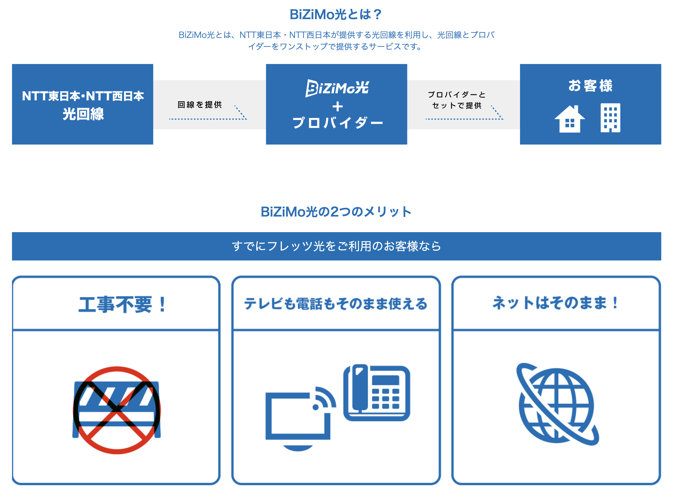 BiZiMo光とは、NTT東日本・NTT西日本が提供する光回線を利用し、光回線とプロバイダーをワンストップで提供するサービスです。